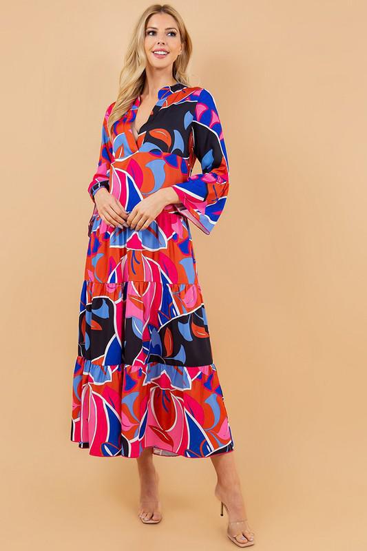 PRINTED LONG SLEEVE V-NECK LONG TUNIC DRESS
